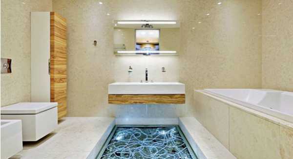Стекло, вероятно, не то, о чем Вы подумаете в первую очередь, выбирая покрытие для пола в ванной. И зря! Стекло, используемое для напольного покрытия, обжигают и делают очень износостойким и устойчивым к образованию трещин. Более того, стекло не боится влаги. А все пятна на нем легко стереть.