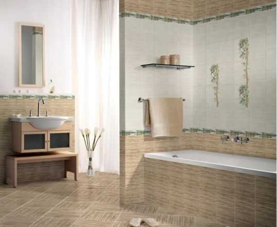 Это, наверное, самый прочный вариант покрытия, которое можно использовать на полу в ванной комнате. Керамическая плитка устойчива к физическому давлению. Керамика для ванной, как правило, покрыта стеклянной глазурью, которая не только не позволяет влаге проникать в пористую структуру материала, но и делает напольное покрытие более декоративным. Глазурь может быть любого оттенка, часто на ней печатают узор.