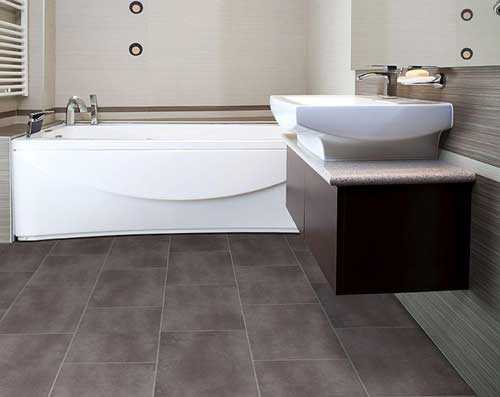 Виниловое покрытие устойчиво к влажности и пятнам и большинством других проблем, с которым сталкивается напольное покрытие в ванной. Однако, виниловая плитка изнашивается быстрее, чем вышеупомянутые варианты. В среднем, в ванной комнате виниловая плитка может прослужить около 8 — 10 лет. Самые дорогие и качественные модели прослужат больше и дольше будут выглядеть привлекательно. Регулярная уборка с теплой водой также желательна.