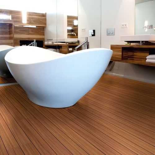 На сегодняшний день такой пол встречается в ванных комнатах крайне редко, поскольку не каждая древесина сможет выдержать регулярно высокий уровень влажности. Для деревянного пола применяют лиственницу и тик, обеспечивают дополнительную гидроизоляцияю. Этот пол красивый, теплый и полезный для здоровья. Все же специалисты рекомендуют заменить дерево влагостойким ламинатом, который будет для ванны более подходящим.
