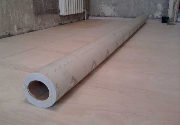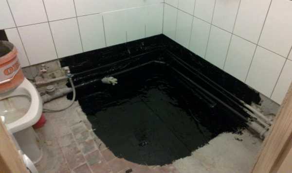 Оклеечная гидроизоляция выполняется рубероидом, наклеенным на битумной мастике. Эта технология доказывает свою надежность более сотни лет. Углы должны быть тщательно сформированы — без переломов и воздушных пузырей, а края рубероида заведены на стены на 50-100мм. В месте порога можно уложить брусок, со временем он будет заменен порогом коробки, к которому необходимо приклеить соответствующий отворот рубероида.