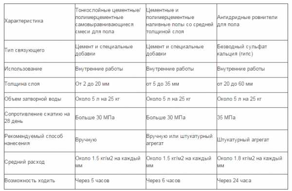 Самовыравнивающиеся смеси можно условно разделить по главному связующему компоненту или целевому назначению.