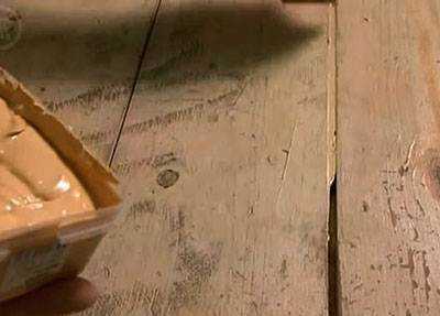 - Подготовка деревянного пола заключается в устранении прогибов при нагрузке и обработке антисептиком. Перед тем, как заливать деревянный пол, на него настилается полиэтиленовая пленка.