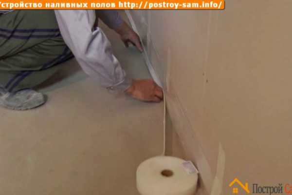- При монтаже самовыравнивающегося пола сразу на бетонное основание по периметру комнаты клеится демпферная лента. Заранее определитесь с толщиной слоя – ленту следует клеить выше уровня пола после высыхания.