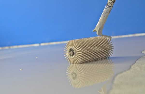 - Нужно правильно выбрать валик – с иголками на 1-2 мм выше уровня заливки. Тогда он не будет сильно перемещать смесь по полу или наоборот, никак не сдвигать ее с места.