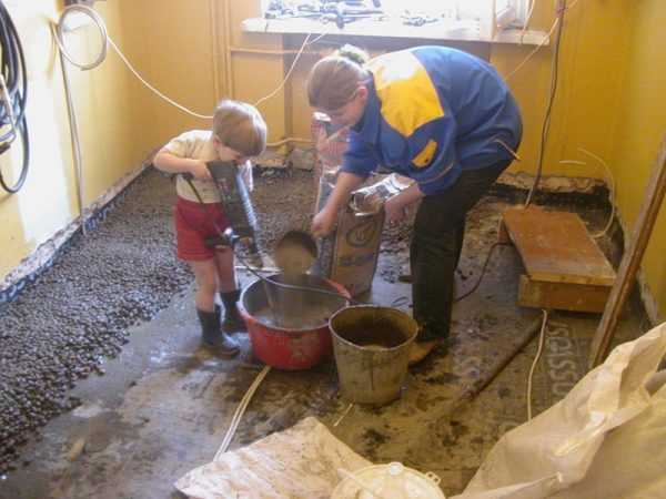 - Лучше всего, конечно, работать вдвоем – один занимается подготовкой бетонного раствора, а второй – непосредственно заливкой и выравниванием стяжки. Про технологию замешивания раствора уже было рассказано выше.