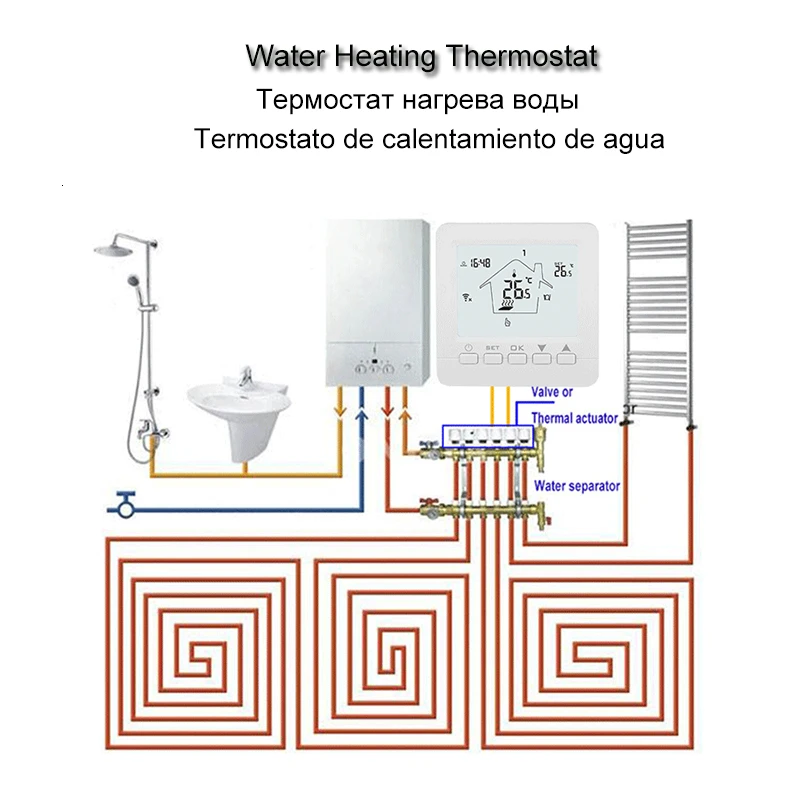 Смотрите картинку ниже. 3A-3000 Термостат нагрева воды управляет клапаном или термоприводом для открытия и закрытия, чтобы поддерживать в комнате пользователя комфортную температуру.Когда термостат обнаруживает, что температура в помещении ниже установленной, он откроет регулирующий клапан, и горячая вода попадет в трубу под полом, после чего в комнате станет тепло. Когда термостат обнаруживает, что температура в помещении выше установленной, он закрывает клапан, и горячая вода перестает попадать в трубу под полом.
