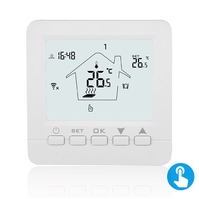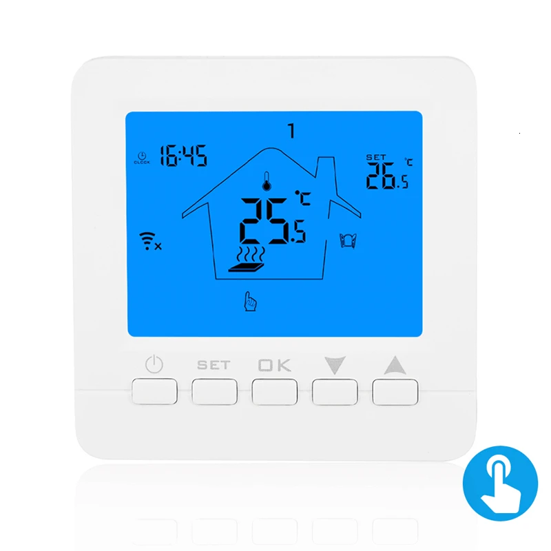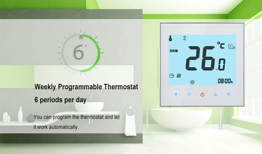 - 3A Термостат для нагрева воды — это термостат с недельным программированием. После программирования термостат будет работать автоматически. Например, пользователь может установить 24 градуса утром и 19 градусов вечером. Тогда термостат будет работать сам по себе, пользователю не нужно постоянно его настраивать.