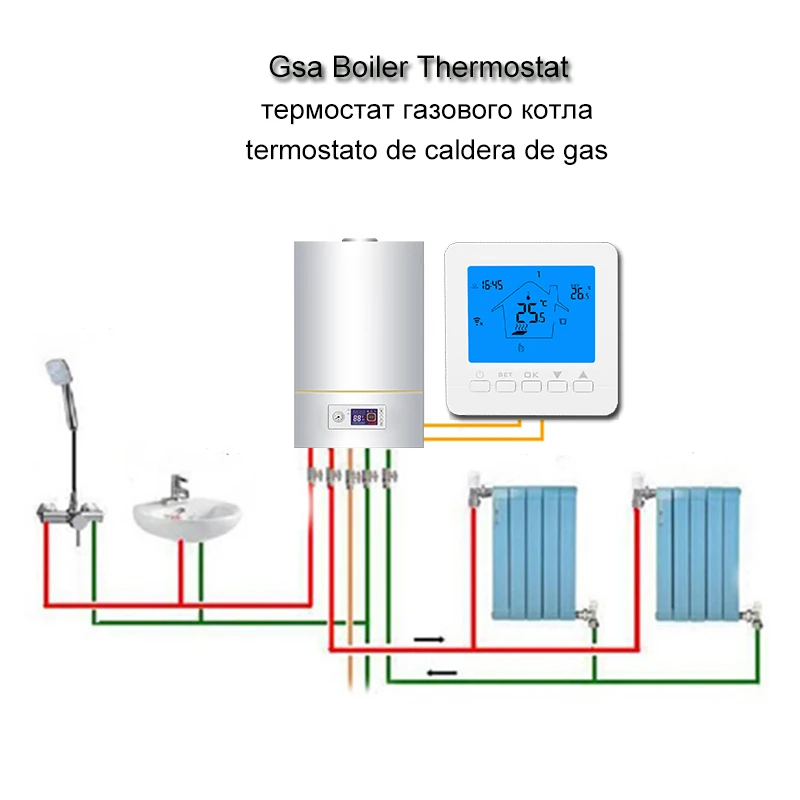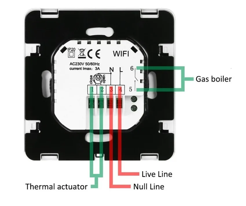 Этот Wi-Fi термостат может подключаться к системе водяного отопления с помощью термопривода и к системе газового котла с помощью включения / выключения.Схема подключения, как показано ниже: