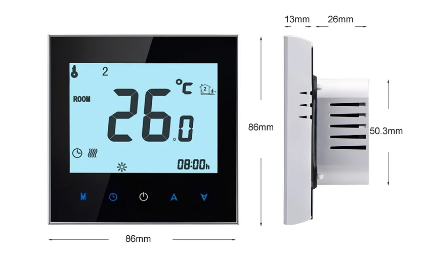 Пользователь может использовать монтажную коробку 86 * 86 для крепления термостата. Если пользователю нужна установочная коробка, проверьте изображение ниже и сделайте заказ.