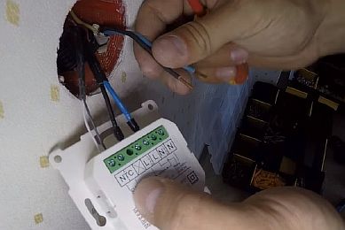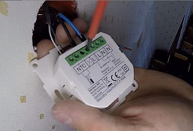 На обратной стороне устройства между двух клемм, ищите изображение в виде змейки (контакты L1 и N1).