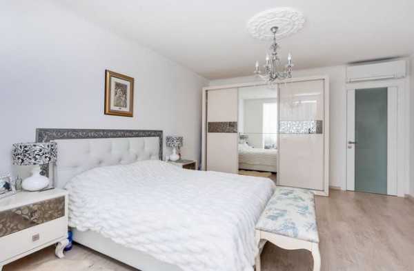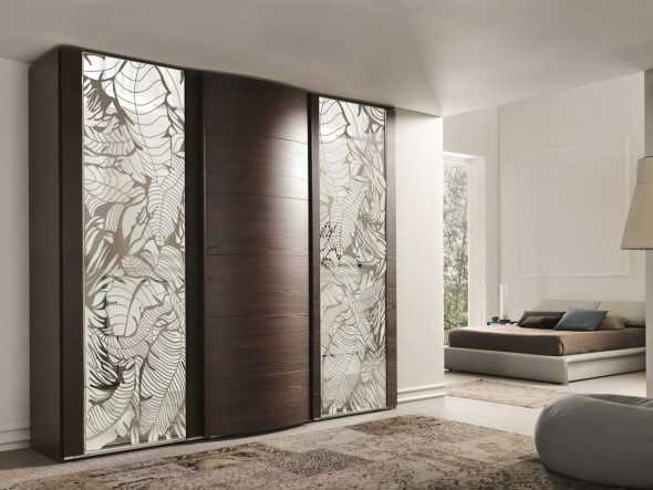 - Что касается дверей шкафа, они могут быть как с рисунком, так и с зеркалами, но некоторые считают, что человек не должен отражаться в зеркале, когда он спит, якобы это негативно сказывается на здоровье. Но в спальне вполне можно использовать стекло с рисунком и текстурой.