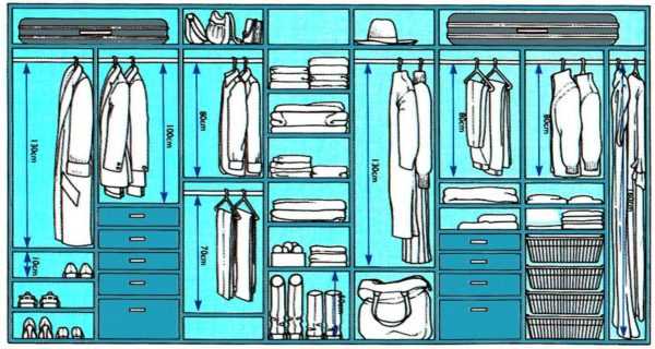 Говоря о хранении гардероба, следует акцентировать внимание на удобстве расположения конструкции таким образом, чтобы можно было без затруднений добраться до любой вещи внутри. Размер проёма должен быть 35-40 см. В секции для короткой одежды, проём должен быть 80 см, для длинной – 150 см. Проём штанги можно рассчитать, добавив к величине ещё 20 см.