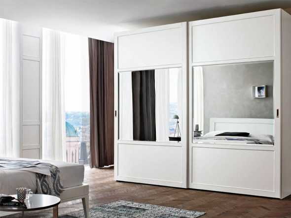 Шкаф-купе в спальне, помимо основной одежды, должен иметь отсеки для постельного белья, махровых халатов и полотенец, под которые отводят верхние большие полки. Для верхней одежды отводят, как правило, самые высокие платяные модули. Нижнее белье стоит хранить в отдельных (для мужчин и женщин) выдвижных ящиках с ячейками. Повседневную одежду лучше располагать на уровне глаз. Так же, как и в гостиной, шкаф-купе в спальне может иметь отсек, где будет расположен телевизор, если нет другой возможности для его установки. Здесь к месту будет наличие гладильной доски с подставкой для утюга.