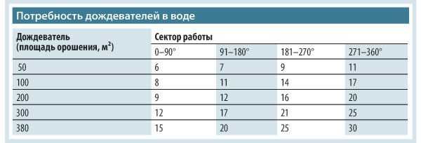 при минимальном секторе полива расход воды в час 10 дождевателей составит 2,2*10*60= 1320 л/час =1,3 куб.м в час