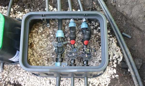 Клапаны открывают и закрывают поступление воды на участки полива. Размеры клапанов подбираются с учетом расхода воды. Располагаются они в земле, в специальных пластиковых коробах с открывающейся для обслуживания верхней крышкой. Управление клапанами осуществляется контроллером.