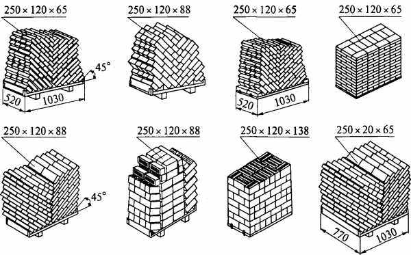 Чтобы кирпич сильно не повреждался, его укладывают на подставки в виде елочки, соблюдая угол 45 градусов. При этом на нижний слой создается минимальное давление.