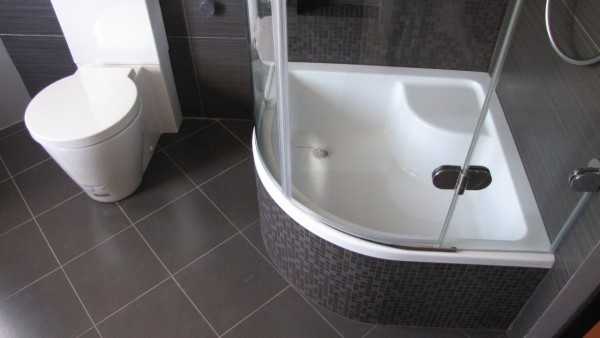 Места соединения чаши поддона со стенками кабинки герметизируют силиконом и закрывают уголками (плинтусами), чтобы жидкость не текла мимо чаши. Трубу укладывают с соблюдением уклона не менее 1.5 – 2 см на метр длины.