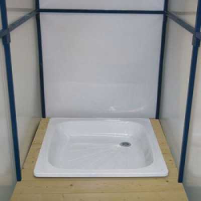 Для этого в конструкции кабинки предусматривают раму для установки поддона на некоторой высоте над землей. В крайнем случае можно немного откопать землю под ним.