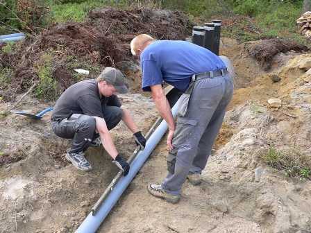 Далее монтируют стандартный сифон любого диаметра, так как расход воды в летнем душе минимальный. Сифон соединяют с пластиковой трубой, которую отводят в сторону, и на расстоянии нескольких метров (чем дальше – тем лучше) выкапывают яму для септика.