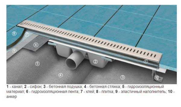 Для отвода воды от приемного устройства прокладывается канал. В стандартных системах он чаще всего специальный который оборудуют вдоль стены ванной комнаты или сбоку душевой с одной из сторон. Кабины могут комплектоваться готовыми каналами длиной 1-1,5 м, причем прокладывают прямые и угловые магистрали. В комплект канала входят: отводящий лоток, решетка и сливное устройство.