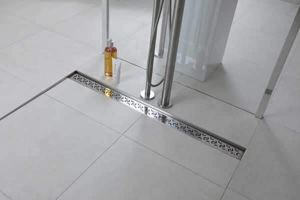 Декоративная планка линейной модели представляет собой удлиненный прямоугольник из нержавеющей стали в виде обычной или узорчатой решетки. Устанавливается, как и точечный слив, на одном уровне с плиткой