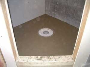 После устройства чистовой стяжки поддон должен иметь вид, как на этом фото: выровненная поверхность с легким наклоном в сторону установленного у стены трапа