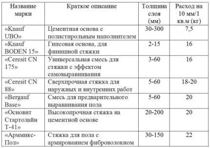 Сводная таблица расхода сухой смеси различных марок. Так, для каждого1 м² стяжки толщиной 50 мм потребуется 37,5 кг смеси «Кнауф Убо» или 80 кг смеси «ЦерезитСН175» (+)