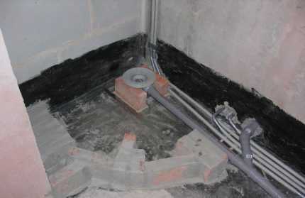 - Нанести на стены черновую отделку, выравнивающую опорную поверхность. Перед этим на обустроенный пол придется настелить слой прочного полиэтилена, защищающий отделку и трап от цементных брызг.