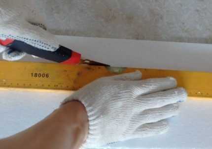 Для разрезания плит на части обычно пользуются строительным ножом. Рассчитывайте величину фрагментов таким образом, чтобы при монтаже между ними оставались небольшие зазоры