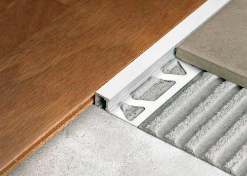 Чтобы ламинированное напольное покрытие было заподлицо с плиточной поверхностью, необходимо использовать специально разработанную направляющую для создания привлекательного шва.