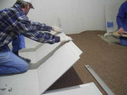 - Если керамзит засыпают по участкам, то укладку плит начинают от дальнего угла. Если поверхность полностью покрывают слоем засыпки, то плиты монтируют от двери.
