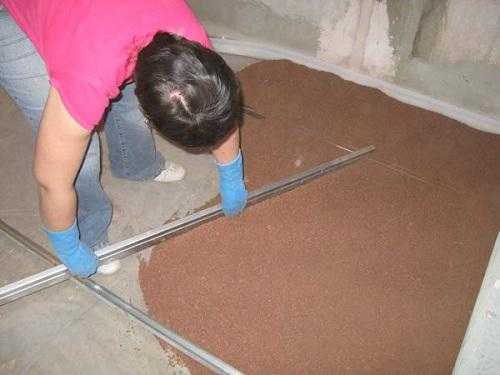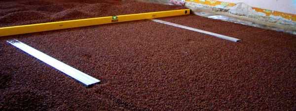 После того как были смонтированы маяки и уложен изолирующий слой, осуществляем непосредственную засыпку выбранного минерала, например, керамзита.Материал нужно засыпать поэтапно: