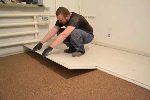 Укладывать гипсоволоконные плиты можно сразу же после подсыпки. Заводские плиты имеют пазы, совмещение которых обеспечивает плотное их прилегание. Когда используется гипсокартон, его укладывают стык в стык.