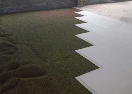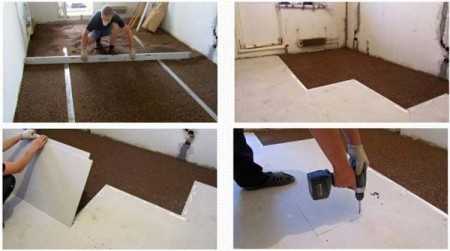 Но есть у ряда мастеров и альтернативный подход – они вначале весь пол засыпают керамзитом, выравнивают его правилом по уровню маяков, а затем перемещаются по полу, подкладывая под себя куски ГВЛ или фанеры.