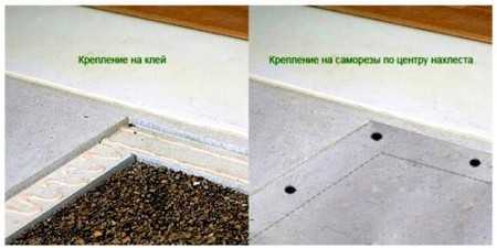 - В случае применения «суперпола Кнауф» фальцы плит нужно промазывать клеем и соединять их особыми саморезами, имеющими длину 19 мм. У этих саморезов есть зенкующие головки, благодаря которым крепежи глубоко утапливаются в ГВЛ. Это помогает в процессе укладки избавиться от ненужных перепадов высот.