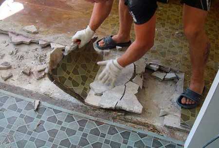 - Если ремонт происходит в квартире, то перед тем как делать сухую стяжку, нужно снять старое напольное покрытие и все слои, находящиеся под ним, пока не появится железобетонное перекрытие.