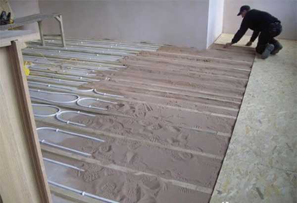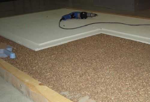 Вначале на черновой пол насыпается сыпучий материал – керамзит, который посыпается песком или перлитом, а затем сверху настилаются плиточные материалы: ГВЛ, ДВП, ДСП или фанера. Модули верхнего скрепляющего слоя скрепляются саморезами и проклеиваются.