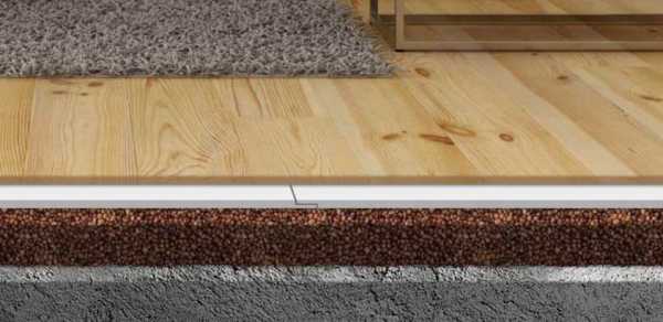 Роль гидроизоляции обычно выполняет толстая полиэтиленовая пленка. В качестве засыпки применяется керамзит, вспученный вермикулит или перлит. С одной стороны этот материал выполняет функцию звукоизоляции и утепления, а с другой помогает выполнить выравнивание пола, имеющего сильные перепады по высоте.