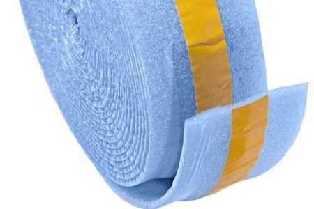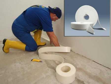 - Затем по периметру стен нужно расположить демпферную ленту. Эта лента делается из вспененного ПВХ, одна из сторон которого самоклеящаяся, защищённая полиэтиленовой плёнкой. Защитную плёнку нужно снимать и сразу же приклеивать ленту к поверхности стены. Назначение демпферной ленты – компенсировать тепловое расширение сухой стяжки. Кроме того, она предупредит контакт выравнивающих листов со стенами, что защитит их от деформаций, а жильцов – от неприятного скрипа.