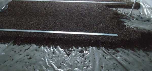 Этап 2. После высыхания «заплаток» укладывается пленка с нахлестом полосы на полосу примерно на 20 см. стыки проклеиваются скотчем. Также она должна заходить на стену на высоту больше толщины слоя примерно на 5 см.