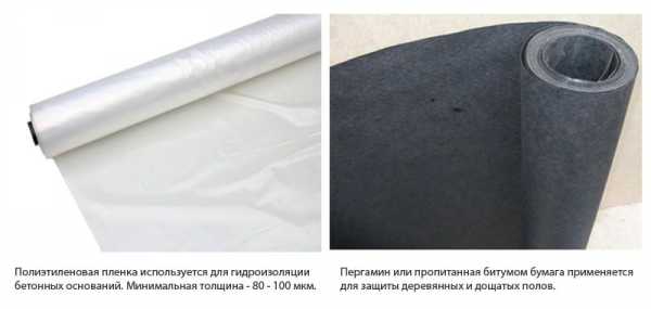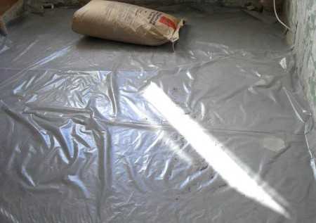 - В качестве гидроизоляции дешевле всего использовать обычную полиэтиленовую плёнку, толщина которой не меньше 0,2 мм. Её количество должно превышать площадь помещения, поскольку часть её пойдёт на перехлёсты и припуски на стены.