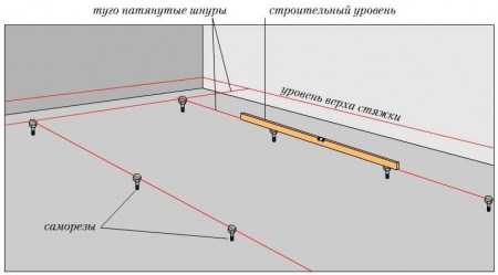 - Аналогичные действия провести со всеми промежуточными саморезами либо поступить проще: натянуть между крайними крепежами достаточно тонкую и прочную нить, и, ориентируясь на её уровень, вкрутить через 20 см в пол саморезы.