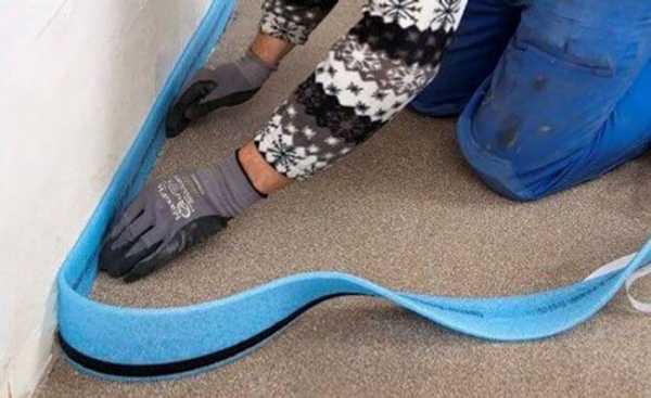 - Укладка демпферной ленты вдоль стен и полиэтиленовой пленки по полу.