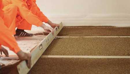 Привлекает сухая бетонная стяжка незначительным весом и универсальностью. Она по минимуму увеличивает массу возводимой конструкции, стоит относительно недорого, к тому же средства поможет сберечь и то, что с нею можно работать самостоятельно, не тратя денег на наёмный труд.