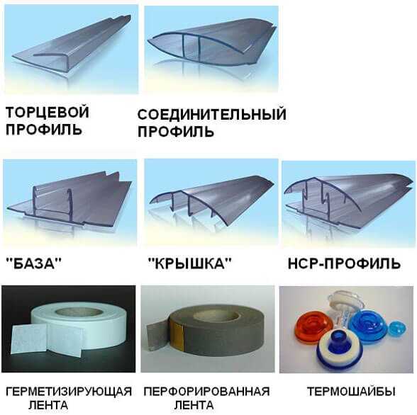 Для крепления к профилю поликарбоната используют специальные саморезы с уплотнительной шайбой. Места соединения листов (стыки) соединяются с помощью Н-образного профиля.
