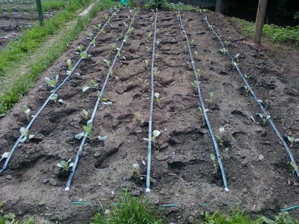 Для полива этой части насаждений мы укладываем капельную линию. Она представляет собой трубу необходимой длины с отверстиями, обустроенными по всей протяженности. Такую трубу можно закопать либо попросту уложить между грядками.
