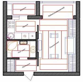 Прежде всего, следует взять план квартиры и схематически изобразить на нем месторасположение стационарной мебели без ножек и напольной бытовой техники. В этих местах не рекомендуется располагать нагревательные элементы теплого пола. С привязкой по размеру отмечаем другим цветом размещение листов ИК теплого пола. Заполненный план должен выглядеть приблизительно следующим образом: