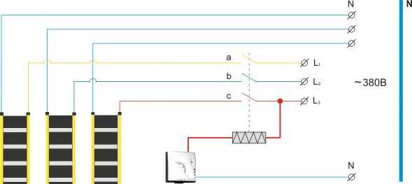 Принципиальная схема подключения кабеля электрического теплого пола к трехпроводной электросети.