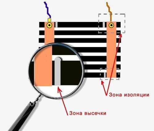 Производится она следующим образом. На расстоянии 3−4 мм от токопроводящей шины дыроколом-клепочником пробивается отверстие с заходом на белую полосу. Ножницами вырезается часть нагревательной полосы шириной 5 мм.